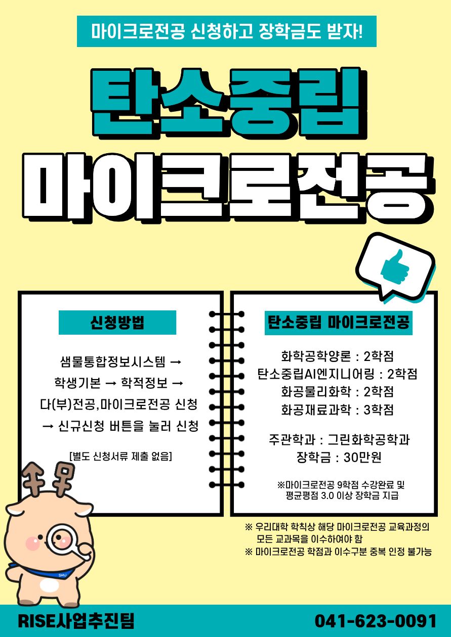 우리 대학에서는 미래 유망 분야인 탄소중립 전문가 양성을 위해 [탄소중립 마이크로전공] 과정을 운영합니다. 해당 교육과정을 이수한 학생들에게는 별도의 장학금 혜택이 제공되오니, 학생 여러분의 많은 관심과 참여 바랍니다.
